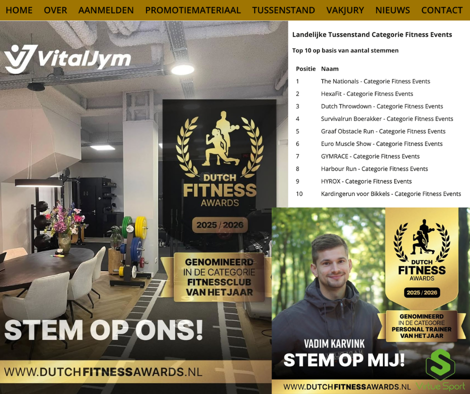 Hebben jullie de laatste tussenstand al gezien, hoe staan jullie ervoor? We zien heel veel enthousiaste en originele oproepen om te stemmen langskomen op de socials, geweldig om te zien! Er kan nog maar tot en met komende zondag 16 november worden gestemd voor de publieksprijzen.Stem op jouw favoriete fitnessclub, personal trainer of fitness event en help jouw favoriet.